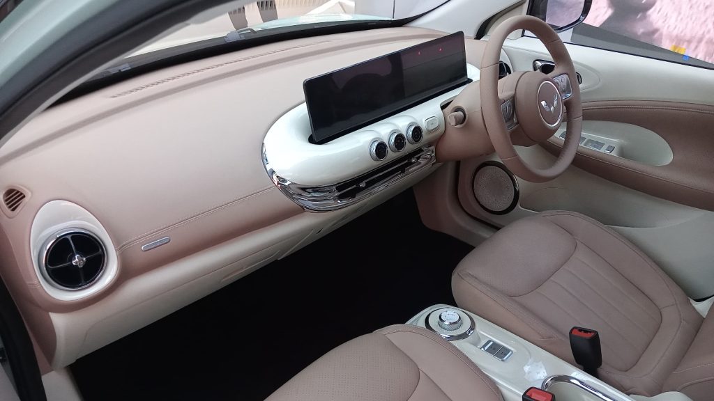 Interior New BinguoEV dirancang lapang dan fungsional, meskipun terdapat beberapa perbedaan antara kedua varian. Varian Pro mengusung nuansa interior Caramel Latte dengan jok berlapis kulit, setir berlapis kulit, dan pengaturan kursi pengemudi elektrik.