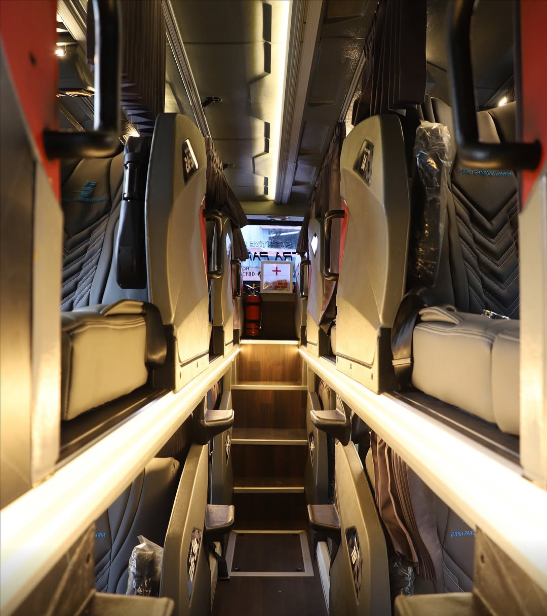 Masuk ke kabinnya, karena bus ini menggunakan kabin kombinasi kursi eksekutif dan sleeper maka pada bagian depan terdapat kursi dengan konfigurasi 2-2 yang nyaman serta dilengkapi juga dengan legrest.