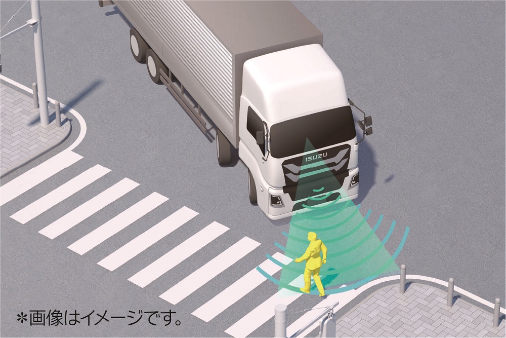Ketika risiko tabrakan dengan pejalan kaki yang melintasi persimpangan meningkat selama belokan kanan atau kiri, pada truk Isuzu Giga terbaru ini sistem Pre-Crash Brake (PCB) diaktifkan untuk membantu menghindari atau mengurangi tabrakan.