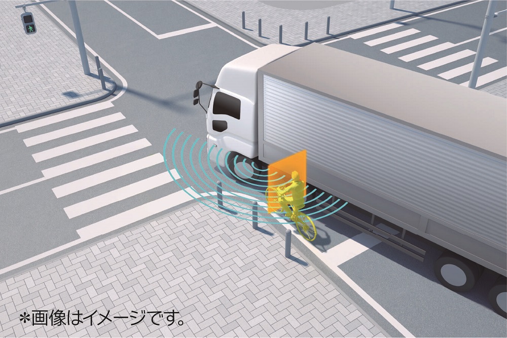 Sementara ketika risiko tabrakan dengan sepeda yang melaju searah di sisi kiri kendaraan meningkat, saat berbelok kiri di persimpangan, rem pada truk diaktifkan otomatis untuk mengurangi kecelakaan tersebut.