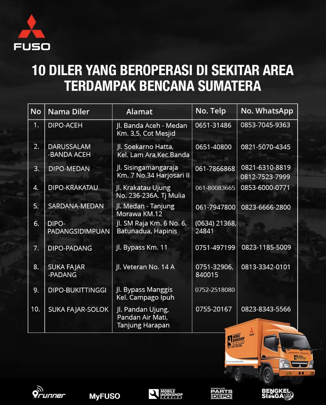 Berikut ini diler Mitsubishi Fuso yang berada di wilayah Sumatera Barat, Sumatera Utara dan Aceh.