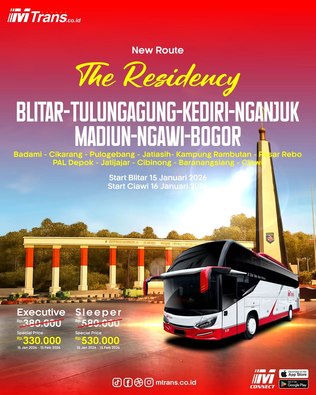 MobilKomersial.com — Perusahaan Otobus (PO) MTrans membuka rute baru Blitar – Bogor via Tulungagung, Kediri, Nganjuk, Madiun dan Ngawi dengan dua kelas yakni eksekutif dan dua sleeper yang berada di kabin bagian depan.