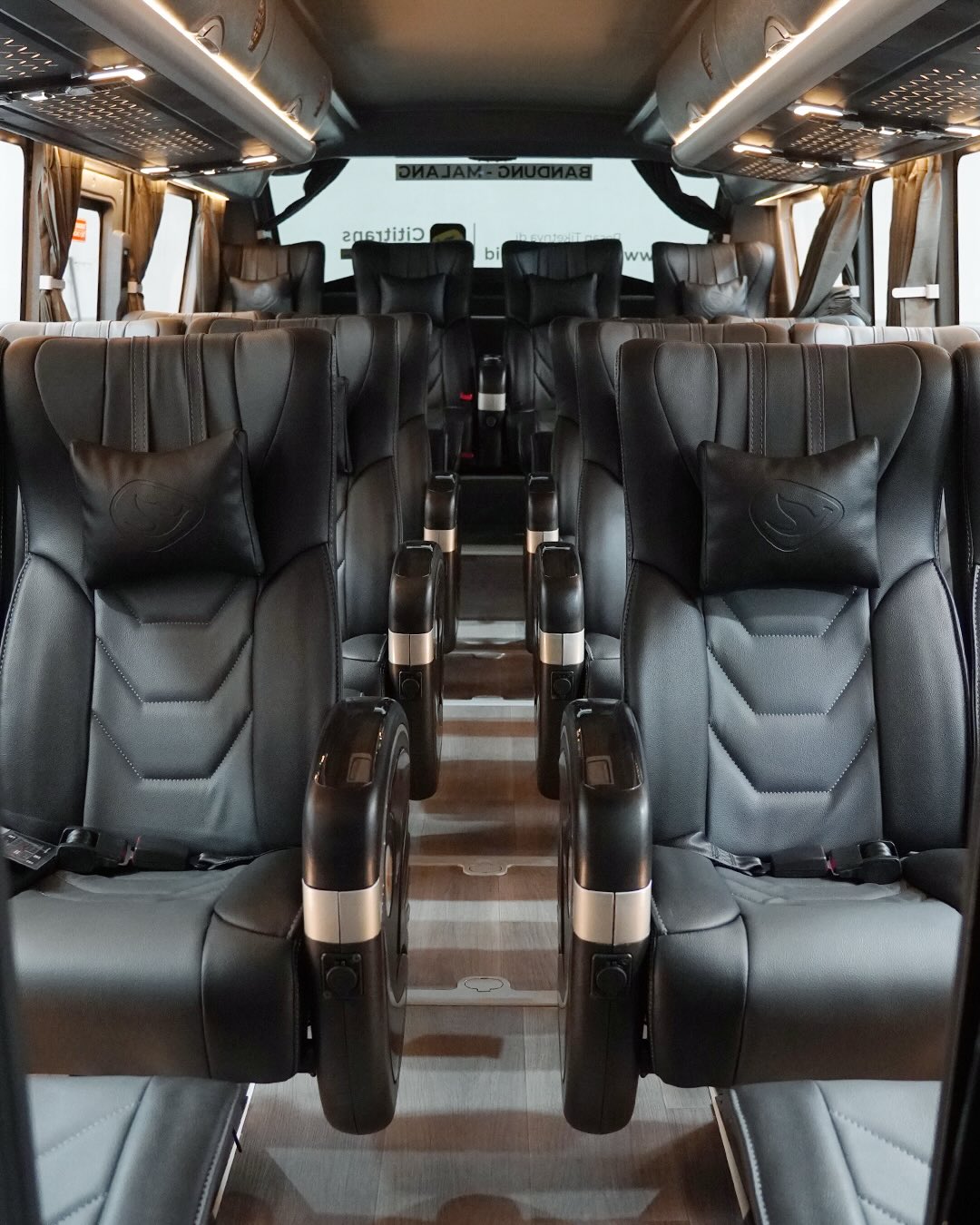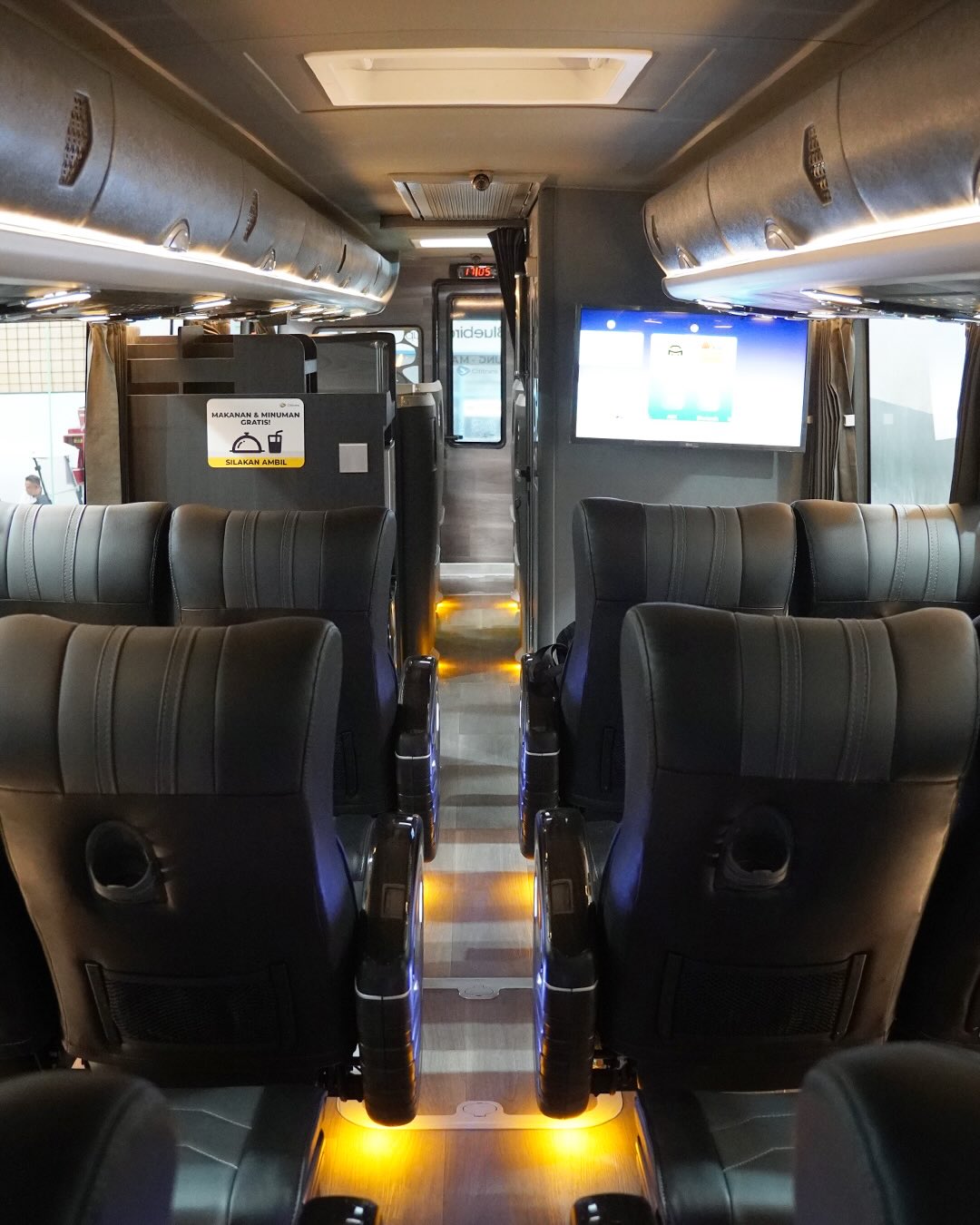 Untuk kursi kabin belakang, terdapat footrest serta kursi yang cukup lebar bagi penumpang, sementara untuk sarana hiburan, terdapat dua layar TV LED berukuran besar pada bagian tengah. Kursi penumpang paling belakang juga dibuat senggang tidak berdempet.