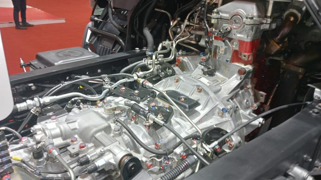 Tenaga itu disalurkan melalui transmisi model M009DD 9-percepatan yang dilengkapi dengan fitur crawler atau gigi rendah, yang secara khusus diaplikasikan untuk kebutuhan heavy duty guna menjaga akselerasi tetap kuat namun tetap hemat bahan bakar.
