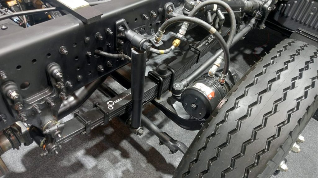 Kemampuan teknisnya juga didukung oleh sistem suspensi tipe Rigid Axle dengan pegas daun semi eliptik, baik di sisi depan maupun belakang, guna memastikan daya tahan maksimal saat memikul beban penuh sesuai batas GVW yang ditentukan.