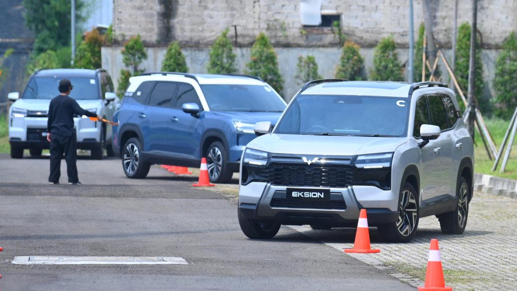 Memasuki sesi yang lebih dinamis, kami membawa Eksion melakukan manuver zig-zag untuk menguji stabilitas sasis dan suspensinya. Meski sebagai SUV 7-seater dengan ground clearance khas mobil keluarga, gejala body roll terasa minim dan terkontrol dengan baik.